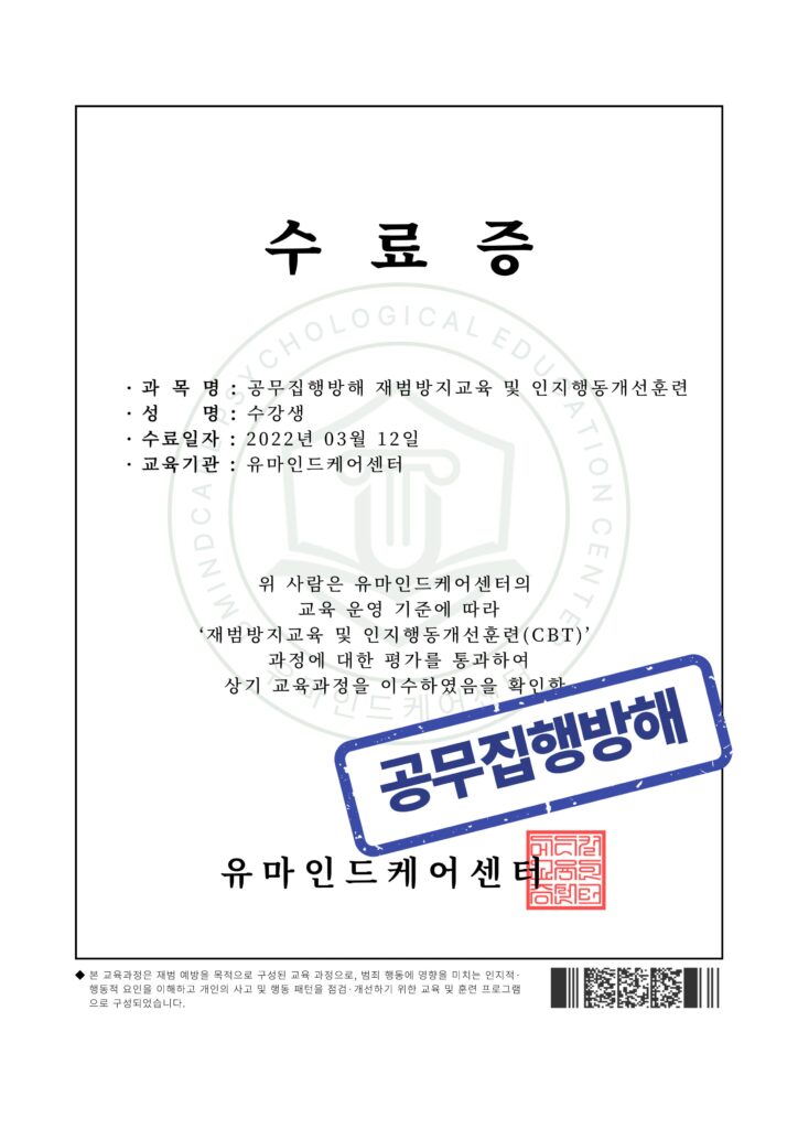 <음주운전/성범죄/공무집행방해 수료증 예시>