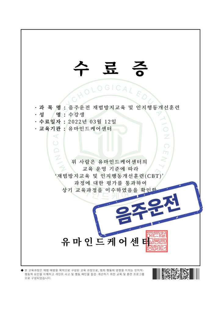 <음주운전/성범죄/공무집행방해/보이스피싱/마약 수료증 예시>